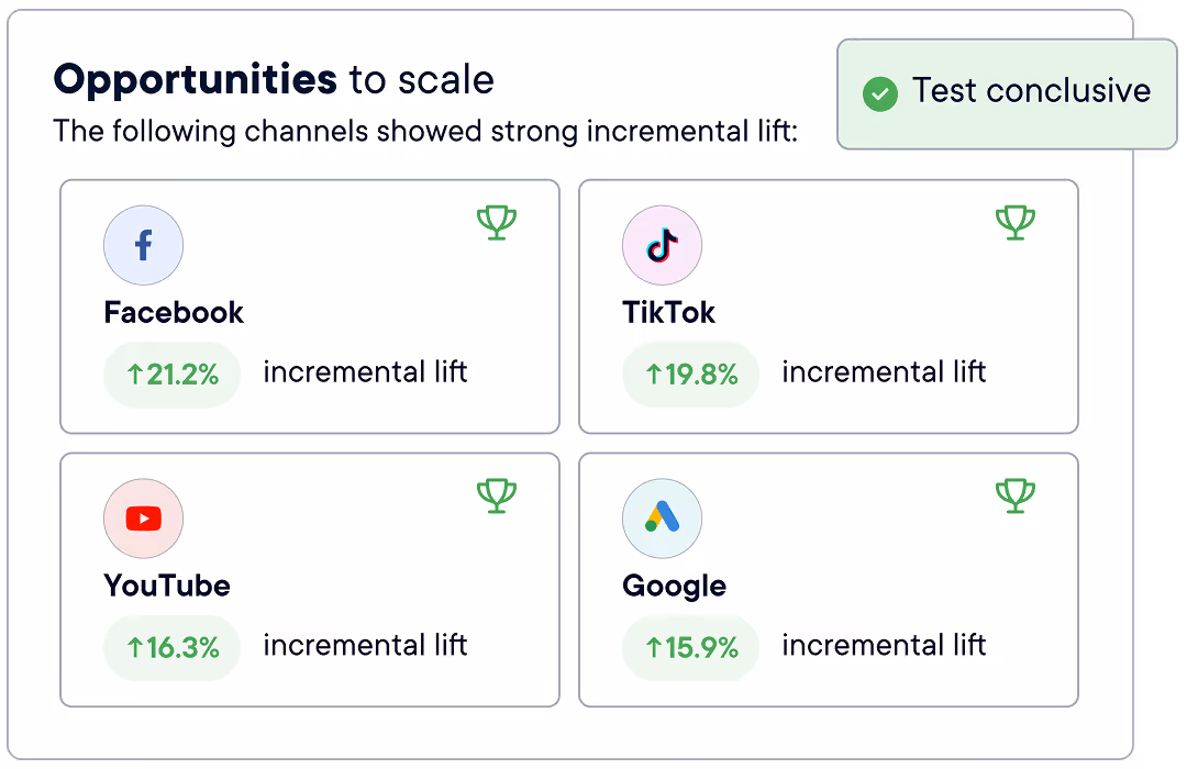 Unlike other incrementality platforms, every test is designed to maximize confidence, account for conversion lag, and deliver reliable insights.