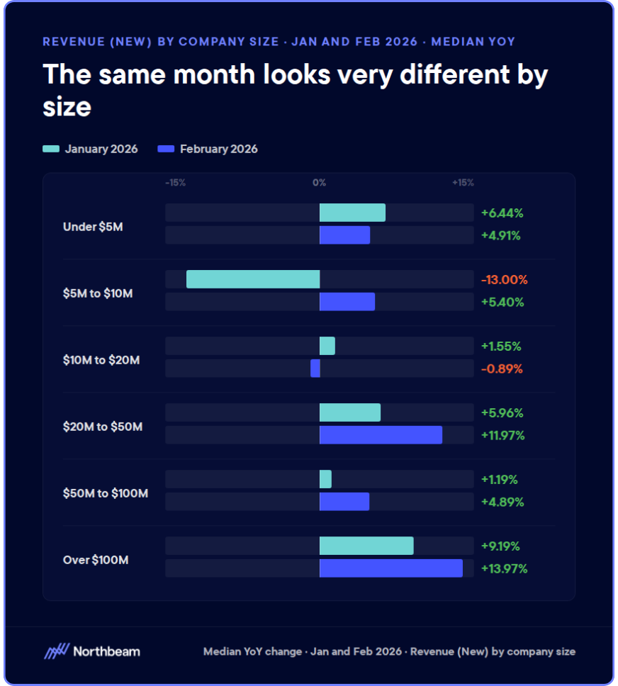 In 2025, sub-$5M businesses saw median revenue decline 1.43 percent despite modest spend increases. The $50M-$100M band grew revenue 15.28 percent. The $100M+ band grew 15.19 percent.
