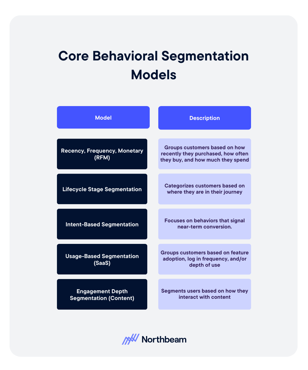 âDifferent behavioral segmentation models organize customer actions in distinct ways. The right model depends on your business type, data availability, and the decisions you are trying to inform.